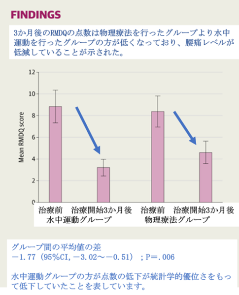 RMDQ(ローランド モリス ディスアビリティー クエスチョネア:慢性腰痛の人の日常生活の困りごと(障害の程度) を評価するための質問票;24点満点で高いほど障害が強いことを表す)の点数は、3か月後、両グループでともに低下が認められましたが、2つのグループ間の比較においては、水中運動グループ群でより低い値をとったことが示されました。