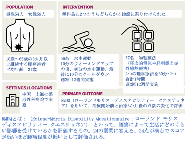 3か月以上継続する腰痛(慢性腰痛)をもった人において、治療的な水中運動を行ったグループと物理療法(経皮的電気神経刺激と赤外線熱療法)を行ったグループ間の腰痛軽減効果を比較した論文です。