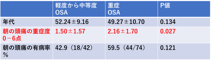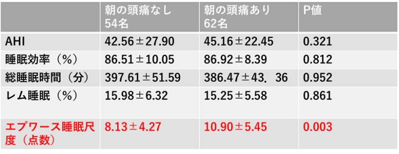 しかし、エプワース眠気尺度スコア(数値が高いほど、眠気が強い)は、朝の頭痛のある群(10.90 ± 5.45)で頭痛がない群(8.13 ± 4.27)よりも統計的な差(P = 0.003)をもって高い結果となっています。
