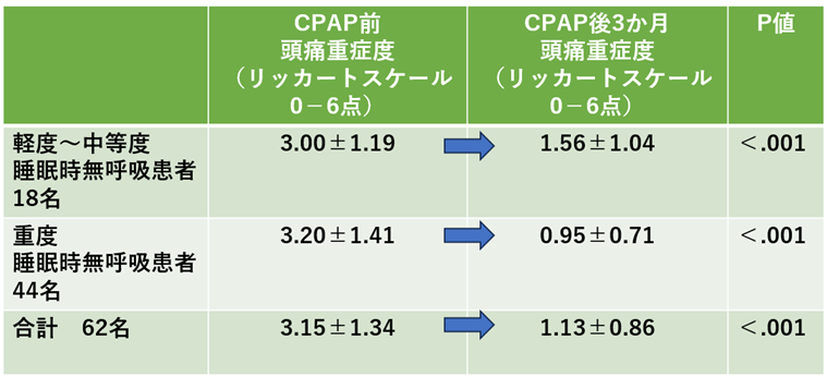 さらに、CPAP治療後の日中の眠気の減少と朝の頭痛改善との間に相関(r = 0.503, P < 0.001)が認められたとしています。言い換えれば、朝の頭痛は日中の眠気と関連しており、CPAP使用で眠気が減少した場合、朝の頭痛の重症度も減少したということです。