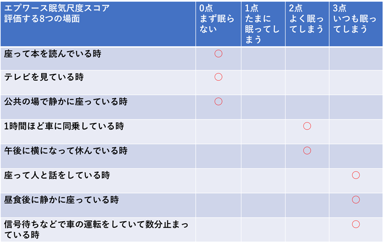 評価するもので合計点数は24点満点となります。評価としては、0~10点 正常範囲 10/11点(カットオフ値) やや眠気が強い可能性 12~24点 病的な眠気の可能性があるとなります。
