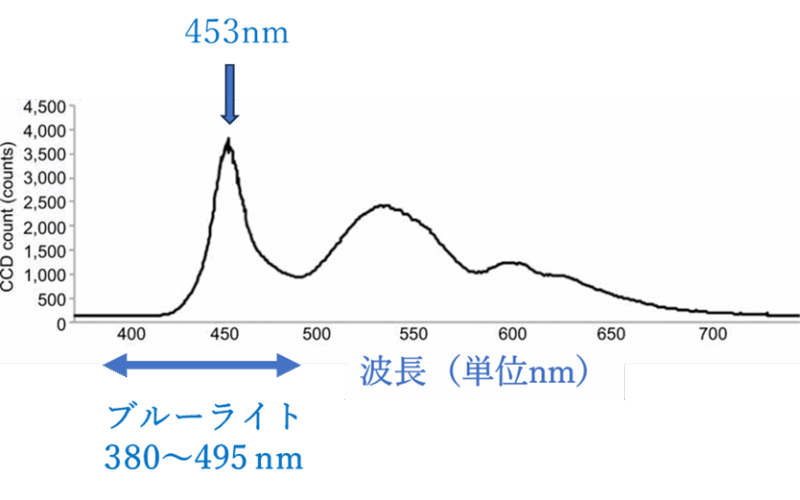 パソコンやスマートフォンなどの高輝度ディスプレイの夜間使用は、睡眠に悪影響を与える可能性があります。高輝度ディスプレイには、短波長の青色光(380〜495 nm)が含まれています(下図)。この短波長は、昼夜のサイクルを制御するうえで大切なメラトニンというホルモン生成に最も影響を与える光波長であることが報告されています。メラトニンは暗くなってくると脳内での生成が盛んになりますが、夜間に短波長の青色光(380〜495 nm)光にさらされると、メラトニンの生成が遅れたり、停止したりすることが報告されています。このため、ブルーライトは、睡眠サイクルの混乱に関係すると報告されています。