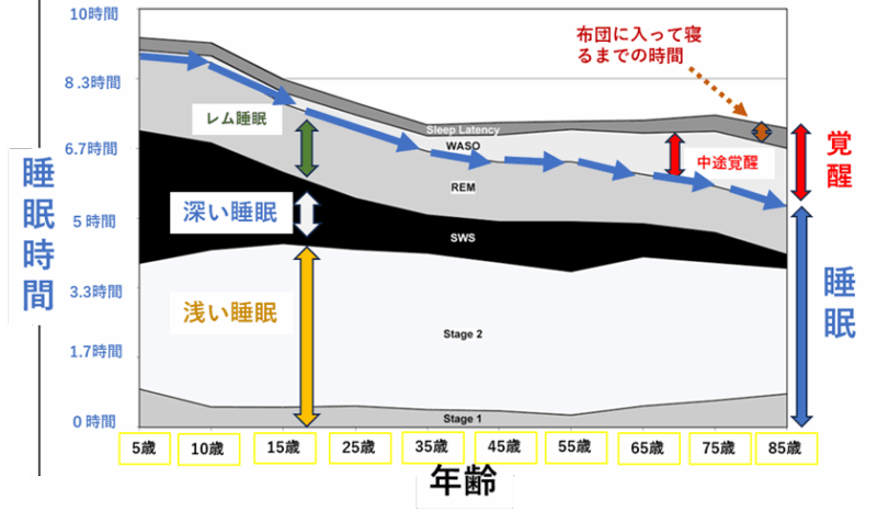 この図をみると時間時間のみならず睡眠の質(深い眠りの割合や中途覚醒の割合)も加齢によって変化していくことがおわかりになると思います。