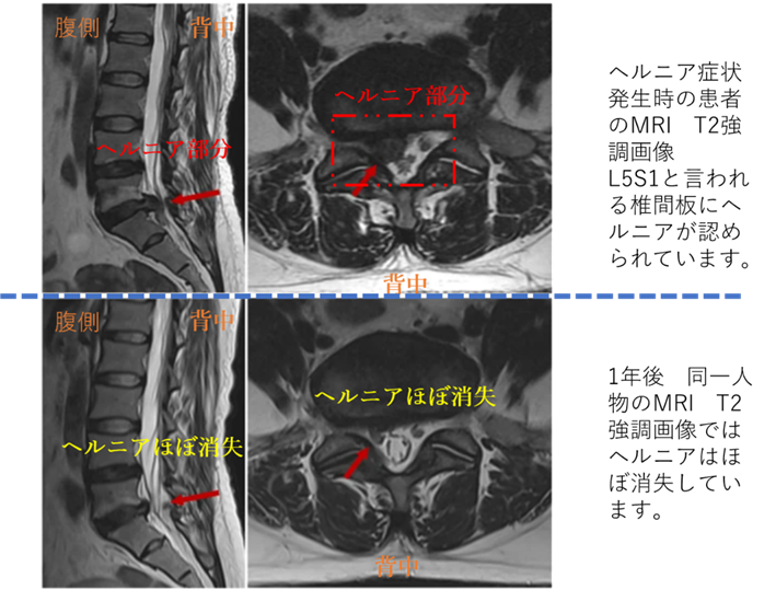 下部の2画像は、年間の保存的治療後の同一人物のMRI画像です。腰下肢の症状は全くなくなっています。画像上もL5/S1椎間板ヘルニアは有意に減少し、突出部も吸収されています。